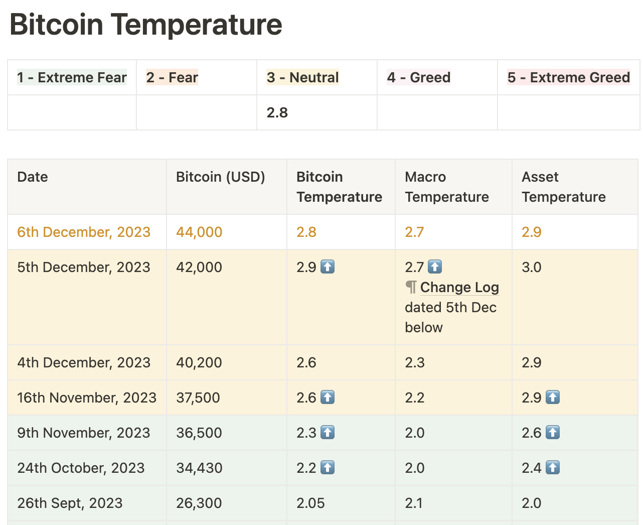 Additionally, it is essential to consider the current state of Bitcoin within the market cycle. Bitcoin is known for its volatility and cyclical nature, experiencing periods of fear and greed. Staying informed about Bitcoin's position in the current cycle can help guide your allocation decisions. We publish a Bitcoin Temperature to advise where Bitcoin is in the current cycle.